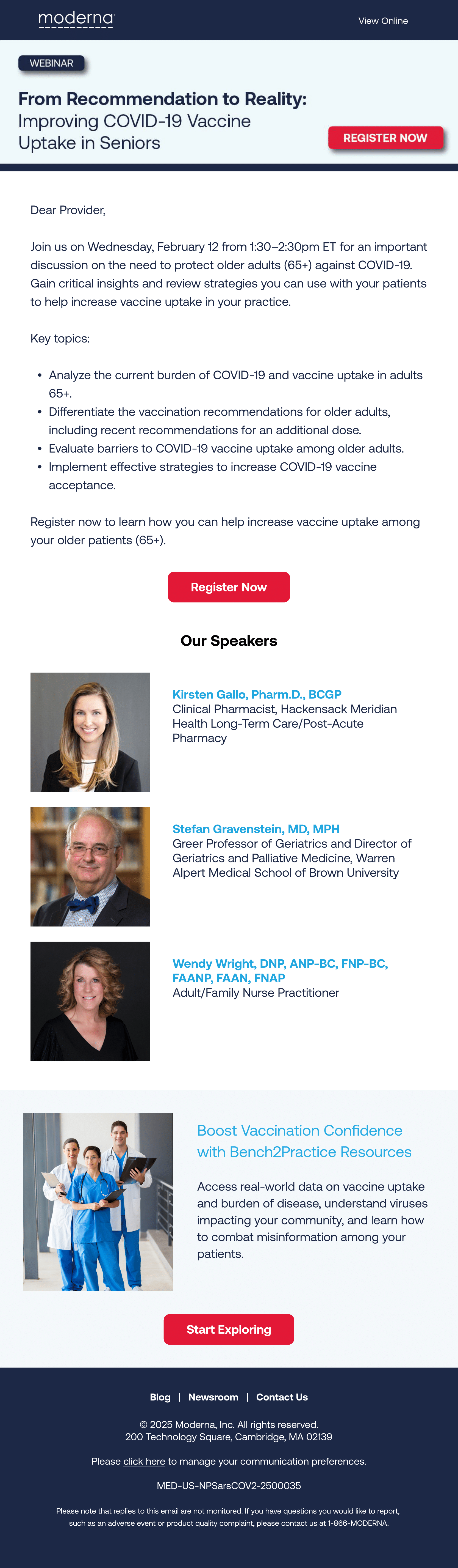 References:1. FDA, “FDA Approves and Authorizes Updated mRNA COVID-19 Vaccines to Better Protect Against Currently Circulating Variants.” Updated August 22, 2024. Accessed August 22, 2024. 2. FDA, “Updated COVID-19 Vaccines for Use in the United States Beginning in Fall 2024. Updated.” Updated August 13, 2024. Accessed August 21, 2024. 3. Spikevax. Prescribing Information. ModernaTX, Inc., 2024.